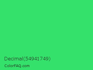 Decimal 54941749 Color is a normal green color and the nearest color is UFO Green #3cd070. Hex code #34e26b and RGB value is rgb(52,226,107). In RGB color space, this color is composed of 20% red, 89% green, 42% blue, In CMYK color space, this color is composed of 77% cyan, 0% magenta, 53% yellow , 11% black , In HSL color space, this color has a hue angle of 139° , 75% saturation and 55% lightness.