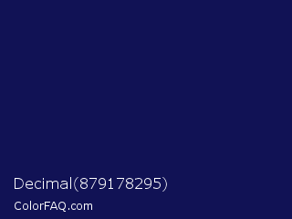 Decimal 879178295 Color is a very dark blue color and the nearest color is Gulf Blue #051657. Hex code #111255 and RGB value is rgb(17,18,85). In RGB color space, this color is composed of 7% red, 7% green, 33% blue, In CMYK color space, this color is composed of 80% cyan, 79% magenta, 0% yellow , 67% black , In HSL color space, this color has a hue angle of 239° , 67% saturation and 20% lightness.