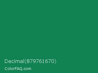 Decimal 879761670 Color is a dark green color and the nearest color is Salem #097f4b. Hex code #118252 and RGB value is rgb(17,130,82). In RGB color space, this color is composed of 7% red, 51% green, 32% blue, In CMYK color space, this color is composed of 87% cyan, 0% magenta, 37% yellow , 49% black , In HSL color space, this color has a hue angle of 155° , 77% saturation and 29% lightness.