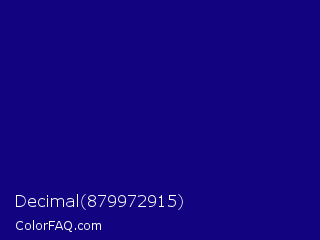 Decimal 879972915 Color is a dark indigo color and the nearest color is Ultramarine #120a8f. Hex code #120481 and RGB value is rgb(18,4,129). In RGB color space, this color is composed of 7% red, 2% green, 51% blue, In CMYK color space, this color is composed of 86% cyan, 97% magenta, 0% yellow , 49% black , In HSL color space, this color has a hue angle of 247° , 94% saturation and 26% lightness.
