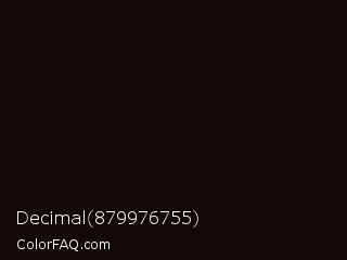 Decimal 879976755 Color is a almost black red color and the nearest color is Asphalt #130a06. Hex code #120805 and RGB value is rgb(18,8,5). In RGB color space, this color is composed of 7% red, 3% green, 2% blue, In CMYK color space, this color is composed of 0% cyan, 56% magenta, 72% yellow , 93% black , In HSL color space, this color has a hue angle of 14° , 57% saturation and 5% lightness.