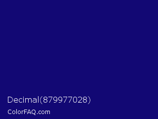 Decimal 879977028 Color is a dark indigo color and the nearest color is Arapawa #110c6c. Hex code #120874 and RGB value is rgb(18,8,116). In RGB color space, this color is composed of 7% red, 3% green, 45% blue, In CMYK color space, this color is composed of 84% cyan, 93% magenta, 0% yellow , 55% black , In HSL color space, this color has a hue angle of 246° , 87% saturation and 24% lightness.