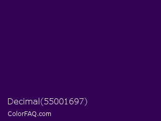 Decimal 55001697 Color is a very dark purple color and the nearest color is Jagger #350e57. Hex code #350355 and RGB value is rgb(53,3,85). In RGB color space, this color is composed of 21% red, 1% green, 33% blue, In CMYK color space, this color is composed of 38% cyan, 96% magenta, 0% yellow , 67% black , In HSL color space, this color has a hue angle of 277° , 93% saturation and 17% lightness.