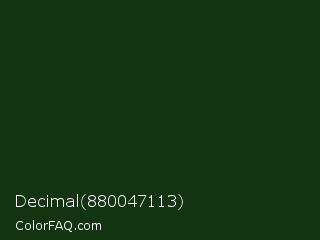 Decimal 880047113 Color is a very dark green color and the nearest color is Palm Leaf #19330e. Hex code #123411 and RGB value is rgb(18,52,17). In RGB color space, this color is composed of 7% red, 20% green, 7% blue, In CMYK color space, this color is composed of 65% cyan, 0% magenta, 67% yellow , 80% black , In HSL color space, this color has a hue angle of 118° , 51% saturation and 14% lightness.