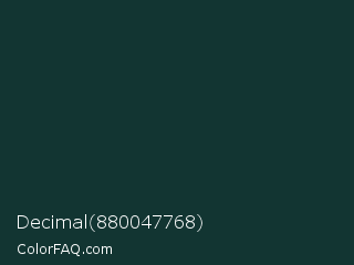 Decimal 880047768 Color is a very dark cyan color and the nearest color is Gable Green #163531. Hex code #123532 and RGB value is rgb(18,53,50). In RGB color space, this color is composed of 7% red, 21% green, 20% blue, In CMYK color space, this color is composed of 66% cyan, 0% magenta, 6% yellow , 79% black , In HSL color space, this color has a hue angle of 175° , 49% saturation and 14% lightness.