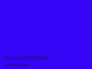 Decimal 55003445 Color is a normal indigo color and the nearest color is Electric Ultramarine #3f00ff. Hex code #3505f7 and RGB value is rgb(53,5,247). In RGB color space, this color is composed of 21% red, 2% green, 97% blue, In CMYK color space, this color is composed of 79% cyan, 98% magenta, 0% yellow , 3% black , In HSL color space, this color has a hue angle of 252° , 96% saturation and 49% lightness.