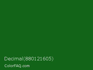 Decimal 880121605 Color is a dark green color and the nearest color is San Felix #0b6207. Hex code #126419 and RGB value is rgb(18,100,25). In RGB color space, this color is composed of 7% red, 39% green, 10% blue, In CMYK color space, this color is composed of 82% cyan, 0% magenta, 75% yellow , 61% black , In HSL color space, this color has a hue angle of 125° , 69% saturation and 23% lightness.