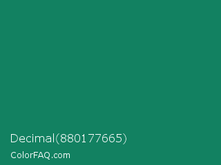 Decimal 880177665 Color is a dark green color and the nearest color is Deep Green Cyan Turquoise #0e7c61. Hex code #128161 and RGB value is rgb(18,129,97). In RGB color space, this color is composed of 7% red, 51% green, 38% blue, In CMYK color space, this color is composed of 86% cyan, 0% magenta, 25% yellow , 49% black , In HSL color space, this color has a hue angle of 163° , 76% saturation and 29% lightness.