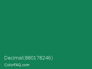 Decimal 880178246 Color is a dark green color and the nearest color is Deep Green Cyan Turquoise #0e7c61. Hex code #128256 and RGB value is rgb(18,130,86). In RGB color space, this color is composed of 7% red, 51% green, 34% blue, In CMYK color space, this color is composed of 86% cyan, 0% magenta, 34% yellow , 49% black , In HSL color space, this color has a hue angle of 156° , 76% saturation and 29% lightness.