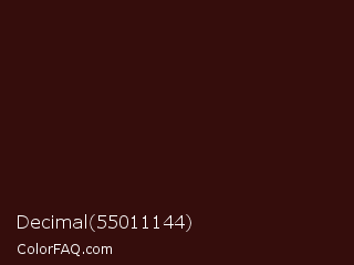 Decimal 55011144 Color is a very dark red color and the nearest color is Aubergine #3b0910. Hex code #350d0c and RGB value is rgb(53,13,12). In RGB color space, this color is composed of 21% red, 5% green, 5% blue, In CMYK color space, this color is composed of 0% cyan, 75% magenta, 77% yellow , 79% black , In HSL color space, this color has a hue angle of 1° , 63% saturation and 13% lightness.