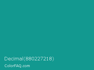 Decimal 880227218 Color is a normal cyan color and the nearest color is Niagara #06a189. Hex code #129990 and RGB value is rgb(18,153,144). In RGB color space, this color is composed of 7% red, 60% green, 56% blue, In CMYK color space, this color is composed of 88% cyan, 0% magenta, 6% yellow , 40% black , In HSL color space, this color has a hue angle of 176° , 79% saturation and 34% lightness.
