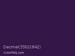 Decimal 55021842 Color is a very dark purple color and the nearest color is Russian Violet #32174d. Hex code #351648 and RGB value is rgb(53,22,72). In RGB color space, this color is composed of 21% red, 9% green, 28% blue, In CMYK color space, this color is composed of 26% cyan, 69% magenta, 0% yellow , 72% black , In HSL color space, this color has a hue angle of 277° , 53% saturation and 18% lightness.