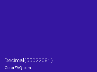Decimal 55022081 Color is a normal indigo color and the nearest color is Blue Gem #2c0e8c. Hex code #3516a1 and RGB value is rgb(53,22,161). In RGB color space, this color is composed of 21% red, 9% green, 63% blue, In CMYK color space, this color is composed of 67% cyan, 86% magenta, 0% yellow , 37% black , In HSL color space, this color has a hue angle of 253° , 76% saturation and 36% lightness.