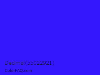 Decimal 55022921 Color is a normal indigo color and the nearest color is Electric Ultramarine #3f00ff. Hex code #3517fd and RGB value is rgb(53,23,253). In RGB color space, this color is composed of 21% red, 9% green, 99% blue, In CMYK color space, this color is composed of 79% cyan, 91% magenta, 0% yellow , 1% black , In HSL color space, this color has a hue angle of 248° , 98% saturation and 54% lightness.