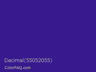 Decimal 55052055 Color is a normal indigo color and the nearest color is Pixie Powder #391285. Hex code #351c8d and RGB value is rgb(53,28,141). In RGB color space, this color is composed of 21% red, 11% green, 55% blue, In CMYK color space, this color is composed of 62% cyan, 80% magenta, 0% yellow , 45% black , In HSL color space, this color has a hue angle of 253° , 67% saturation and 33% lightness.