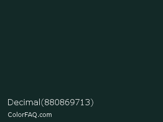 Decimal 880869713 Color is a very dark cyan color and the nearest color is Firefly #0e2a30. Hex code #132927 and RGB value is rgb(19,41,39). In RGB color space, this color is composed of 7% red, 16% green, 15% blue, In CMYK color space, this color is composed of 54% cyan, 0% magenta, 5% yellow , 84% black , In HSL color space, this color has a hue angle of 175° , 37% saturation and 12% lightness.