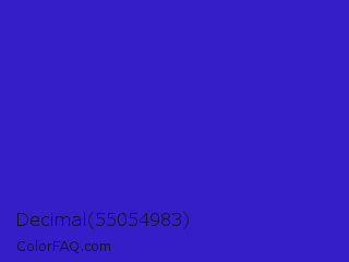 Decimal 55054983 Color is a normal indigo color and the nearest color is Interdimensional Blue #360ccc. Hex code #351ec7 and RGB value is rgb(53,30,199). In RGB color space, this color is composed of 21% red, 12% green, 78% blue, In CMYK color space, this color is composed of 73% cyan, 85% magenta, 0% yellow , 22% black , In HSL color space, this color has a hue angle of 248° , 74% saturation and 45% lightness.