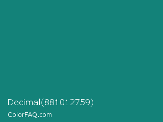 Decimal 881012759 Color is a dark cyan color and the nearest color is Surfie Green #0c7a79. Hex code #138279 and RGB value is rgb(19,130,121). In RGB color space, this color is composed of 7% red, 51% green, 47% blue, In CMYK color space, this color is composed of 85% cyan, 0% magenta, 7% yellow , 49% black , In HSL color space, this color has a hue angle of 175° , 74% saturation and 29% lightness.