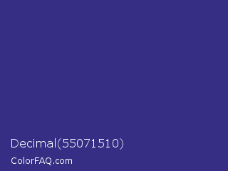 Decimal 55071510 Color is a normal indigo color and the nearest color is Cosmic Cobalt #2e2d88. Hex code #352e84 and RGB value is rgb(53,46,132). In RGB color space, this color is composed of 21% red, 18% green, 52% blue, In CMYK color space, this color is composed of 60% cyan, 65% magenta, 0% yellow , 48% black , In HSL color space, this color has a hue angle of 245° , 48% saturation and 35% lightness.