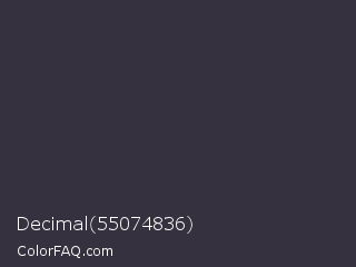 Decimal 55074836 Color is a very dark indigo color and the nearest color is Tuna #353542. Hex code #35313e and RGB value is rgb(53,49,62). In RGB color space, this color is composed of 21% red, 19% green, 24% blue, In CMYK color space, this color is composed of 15% cyan, 21% magenta, 0% yellow , 76% black , In HSL color space, this color has a hue angle of 258° , 12% saturation and 22% lightness.