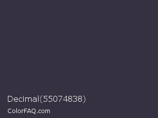 Decimal 55074838 Color is a very dark indigo color and the nearest color is Tuna #353542. Hex code #353140 and RGB value is rgb(53,49,64). In RGB color space, this color is composed of 21% red, 19% green, 25% blue, In CMYK color space, this color is composed of 17% cyan, 23% magenta, 0% yellow , 75% black , In HSL color space, this color has a hue angle of 256° , 13% saturation and 22% lightness.
