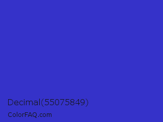 Decimal 55075849 Color is a normal indigo color and the nearest color is Governor Bay #2f3cb3. Hex code #3532c9 and RGB value is rgb(53,50,201). In RGB color space, this color is composed of 21% red, 20% green, 79% blue, In CMYK color space, this color is composed of 74% cyan, 75% magenta, 0% yellow , 21% black , In HSL color space, this color has a hue angle of 241° , 60% saturation and 49% lightness.