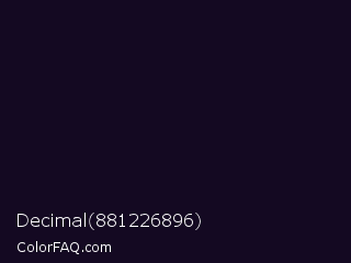 Decimal 881226896 Color is a almost black violet color and the nearest color is Deep Ebony #0c0b1d. Hex code #140922 and RGB value is rgb(20,9,34). In RGB color space, this color is composed of 8% red, 4% green, 13% blue, In CMYK color space, this color is composed of 41% cyan, 74% magenta, 0% yellow , 87% black , In HSL color space, this color has a hue angle of 266° , 58% saturation and 8% lightness.