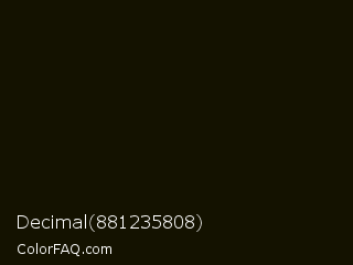 Decimal 881235808 Color is a almost black yellow color and the nearest color is Green Waterloo #101405. Hex code #141200 and RGB value is rgb(20,18,0). In RGB color space, this color is composed of 8% red, 7% green, 0% blue, In CMYK color space, this color is composed of 0% cyan, 10% magenta, 100% yellow , 92% black , In HSL color space, this color has a hue angle of 54° , 100% saturation and 4% lightness.