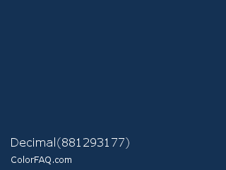 Decimal 881293177 Color is a very dark blue color and the nearest color is Nile Blue #193751. Hex code #143153 and RGB value is rgb(20,49,83). In RGB color space, this color is composed of 8% red, 19% green, 33% blue, In CMYK color space, this color is composed of 76% cyan, 41% magenta, 0% yellow , 67% black , In HSL color space, this color has a hue angle of 212° , 61% saturation and 20% lightness.