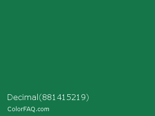 Decimal 881415219 Color is a dark green color and the nearest color is Dark Spring Green #177245. Hex code #147649 and RGB value is rgb(20,118,73). In RGB color space, this color is composed of 8% red, 46% green, 29% blue, In CMYK color space, this color is composed of 83% cyan, 0% magenta, 38% yellow , 54% black , In HSL color space, this color has a hue angle of 152° , 71% saturation and 27% lightness.