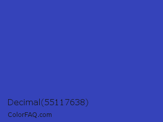 Decimal 55117638 Color is a normal blue color and the nearest color is Violet Blue #324ab2. Hex code #3543ba and RGB value is rgb(53,67,186). In RGB color space, this color is composed of 21% red, 26% green, 73% blue, In CMYK color space, this color is composed of 72% cyan, 64% magenta, 0% yellow , 27% black , In HSL color space, this color has a hue angle of 234° , 56% saturation and 47% lightness.