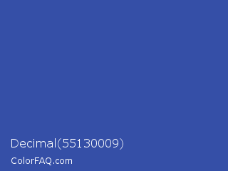 Decimal 55130009 Color is a normal blue color and the nearest color is Sapphire #2f519e. Hex code #354fa7 and RGB value is rgb(53,79,167). In RGB color space, this color is composed of 21% red, 31% green, 65% blue, In CMYK color space, this color is composed of 68% cyan, 53% magenta, 0% yellow , 35% black , In HSL color space, this color has a hue angle of 226° , 52% saturation and 43% lightness.