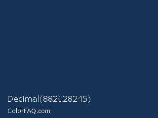 Decimal 882128245 Color is a very dark blue color and the nearest color is Nile Blue #193751. Hex code #153257 and RGB value is rgb(21,50,87). In RGB color space, this color is composed of 8% red, 20% green, 34% blue, In CMYK color space, this color is composed of 76% cyan, 43% magenta, 0% yellow , 66% black , In HSL color space, this color has a hue angle of 214° , 61% saturation and 21% lightness.