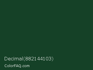 Decimal 882144103 Color is a very dark green color and the nearest color is Everglade #1c402e. Hex code #154127 and RGB value is rgb(21,65,39). In RGB color space, this color is composed of 8% red, 25% green, 15% blue, In CMYK color space, this color is composed of 68% cyan, 0% magenta, 40% yellow , 75% black , In HSL color space, this color has a hue angle of 145° , 51% saturation and 17% lightness.