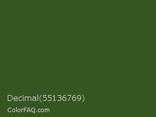 Decimal 55136769 Color is a dark green color and the nearest color is Mughal Green #306030. Hex code #355521 and RGB value is rgb(53,85,33). In RGB color space, this color is composed of 21% red, 33% green, 13% blue, In CMYK color space, this color is composed of 38% cyan, 0% magenta, 61% yellow , 67% black , In HSL color space, this color has a hue angle of 97° , 44% saturation and 23% lightness.