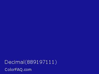 Decimal 889197111 Color is a normal indigo color and the nearest color is Ultramarine #120a8f. Hex code #161395 and RGB value is rgb(22,19,149). In RGB color space, this color is composed of 9% red, 7% green, 58% blue, In CMYK color space, this color is composed of 85% cyan, 87% magenta, 0% yellow , 42% black , In HSL color space, this color has a hue angle of 241° , 77% saturation and 33% lightness.
