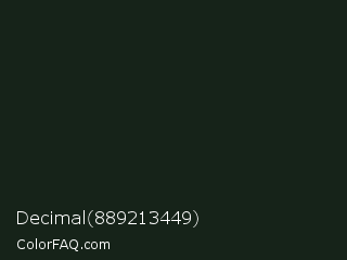 Decimal 889213449 Color is a very dark green color and the nearest color is Dark Jungle Green #1a2421. Hex code #162319 and RGB value is rgb(22,35,25). In RGB color space, this color is composed of 9% red, 14% green, 10% blue, In CMYK color space, this color is composed of 37% cyan, 0% magenta, 29% yellow , 86% black , In HSL color space, this color has a hue angle of 134° , 23% saturation and 11% lightness.