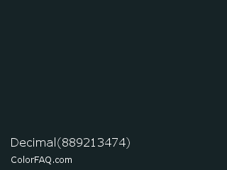 Decimal 889213474 Color is a very dark cyan color and the nearest color is Dark Jungle Green #1a2421. Hex code #162326 and RGB value is rgb(22,35,38). In RGB color space, this color is composed of 9% red, 14% green, 15% blue, In CMYK color space, this color is composed of 42% cyan, 8% magenta, 0% yellow , 85% black , In HSL color space, this color has a hue angle of 191° , 27% saturation and 12% lightness.