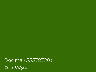 Decimal 55578720 Color is a very dark green color and the nearest color is Green Leaf #436a0d. Hex code #356c04 and RGB value is rgb(53,108,4). In RGB color space, this color is composed of 21% red, 42% green, 2% blue, In CMYK color space, this color is composed of 51% cyan, 0% magenta, 96% yellow , 58% black , In HSL color space, this color has a hue angle of 92° , 93% saturation and 22% lightness.