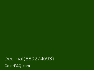 Decimal 889274693 Color is a very dark green color and the nearest color is Dark Fern #0a480d. Hex code #164601 and RGB value is rgb(22,70,1). In RGB color space, this color is composed of 9% red, 27% green, 0% blue, In CMYK color space, this color is composed of 69% cyan, 0% magenta, 99% yellow , 73% black , In HSL color space, this color has a hue angle of 102° , 97% saturation and 14% lightness.