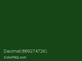 Decimal 889274726 Color is a very dark green color and the nearest color is Parsley #134f19. Hex code #164616 and RGB value is rgb(22,70,22). In RGB color space, this color is composed of 9% red, 27% green, 9% blue, In CMYK color space, this color is composed of 69% cyan, 0% magenta, 69% yellow , 73% black , In HSL color space, this color has a hue angle of 120° , 52% saturation and 18% lightness.