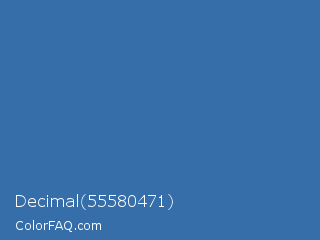 Decimal 55580471 Color is a normal blue color and the nearest color is San Marino #456cac. Hex code #356ea9 and RGB value is rgb(53,110,169). In RGB color space, this color is composed of 21% red, 43% green, 66% blue, In CMYK color space, this color is composed of 69% cyan, 35% magenta, 0% yellow , 34% black , In HSL color space, this color has a hue angle of 211° , 52% saturation and 44% lightness.