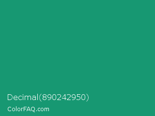 Decimal 890242950 Color is a normal green color and the nearest color is Green Crayola #1cac78. Hex code #179872 and RGB value is rgb(23,152,114). In RGB color space, this color is composed of 9% red, 60% green, 45% blue, In CMYK color space, this color is composed of 85% cyan, 0% magenta, 25% yellow , 40% black , In HSL color space, this color has a hue angle of 162° , 74% saturation and 34% lightness.