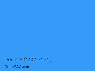 Decimal 55653175 Color is a normal blue color and the nearest color is Brilliant Azure #3399ff. Hex code #359bf9 and RGB value is rgb(53,155,249). In RGB color space, this color is composed of 21% red, 61% green, 98% blue, In CMYK color space, this color is composed of 79% cyan, 38% magenta, 0% yellow , 2% black , In HSL color space, this color has a hue angle of 209° , 94% saturation and 59% lightness.