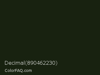 Decimal 890462230 Color is a very dark green color and the nearest color is Hunter Green #161d10. Hex code #182210 and RGB value is rgb(24,34,16). In RGB color space, this color is composed of 9% red, 13% green, 6% blue, In CMYK color space, this color is composed of 29% cyan, 0% magenta, 53% yellow , 87% black , In HSL color space, this color has a hue angle of 93° , 36% saturation and 10% lightness.