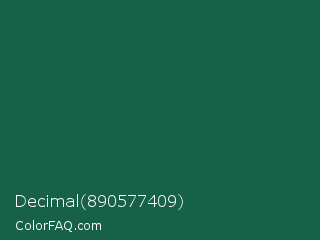 Decimal 890577409 Color is a dark green color and the nearest color is Green Pea #1d6142. Hex code #186149 and RGB value is rgb(24,97,73). In RGB color space, this color is composed of 9% red, 38% green, 29% blue, In CMYK color space, this color is composed of 75% cyan, 0% magenta, 25% yellow , 62% black , In HSL color space, this color has a hue angle of 160° , 60% saturation and 24% lightness.