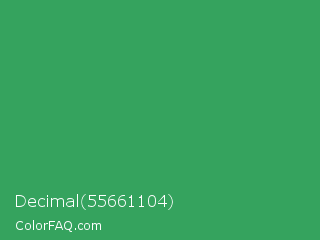 Decimal 55661104 Color is a normal green color and the nearest color is Chateau Green #40a860. Hex code #35a35e and RGB value is rgb(53,163,94). In RGB color space, this color is composed of 21% red, 64% green, 37% blue, In CMYK color space, this color is composed of 67% cyan, 0% magenta, 42% yellow , 36% black , In HSL color space, this color has a hue angle of 142° , 51% saturation and 42% lightness.