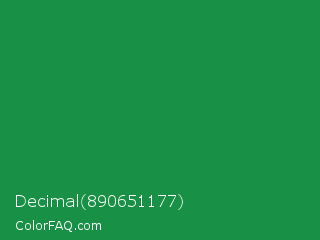 Decimal 890651177 Color is a normal green color and the nearest color is Salem #097f4b. Hex code #189045 and RGB value is rgb(24,144,69). In RGB color space, this color is composed of 9% red, 56% green, 27% blue, In CMYK color space, this color is composed of 83% cyan, 0% magenta, 52% yellow , 44% black , In HSL color space, this color has a hue angle of 143° , 71% saturation and 33% lightness.