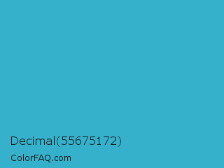 Decimal 55675172 Color is a normal cyan color and the nearest color is Pelorous #3eabbf. Hex code #35b1cc and RGB value is rgb(53,177,204). In RGB color space, this color is composed of 21% red, 69% green, 80% blue, In CMYK color space, this color is composed of 74% cyan, 13% magenta, 0% yellow , 20% black , In HSL color space, this color has a hue angle of 191° , 60% saturation and 50% lightness.