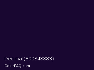 Decimal 890848883 Color is a very dark violet color and the nearest color is Haiti #1b1035. Hex code #190731 and RGB value is rgb(25,7,49). In RGB color space, this color is composed of 10% red, 3% green, 19% blue, In CMYK color space, this color is composed of 49% cyan, 86% magenta, 0% yellow , 81% black , In HSL color space, this color has a hue angle of 266° , 75% saturation and 11% lightness.